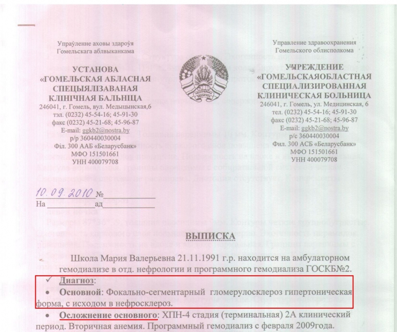Но с 15 лет начались проблемы со здоровьем. Резко ухудшились анализы. Почти 2 года мы пролежали в больницах на различных обследованиях и лечениях и в Минске, и в Гомеле. Погибали почки.