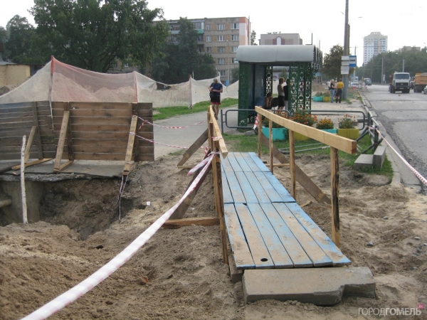 Сразу о хорошем – пешеходные мостики все-таки появились. Вернее, зря мы о нем в таком множественном числе – он пока в гордом одиночестве. Вначале его проложили прямо над ямой, но состояние мостика заставляло опасаться за его сохранность, видимо, поэтому его перенесли. Ямы стараются закрывать щитами из досок, наконец-то оградили котлованы и дорогу предупреждающими лентами.