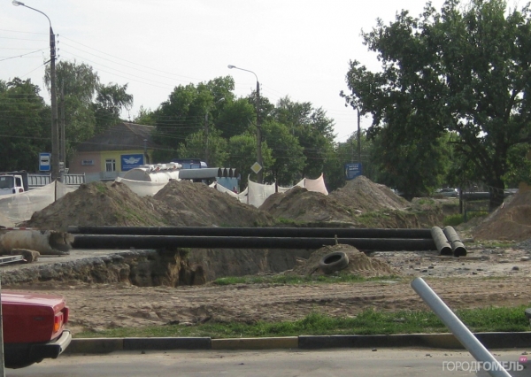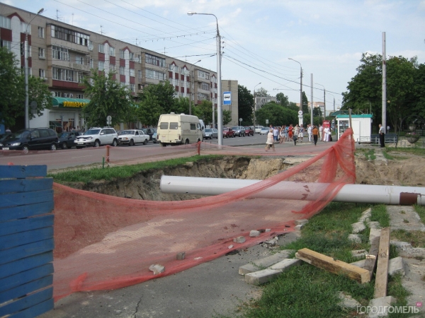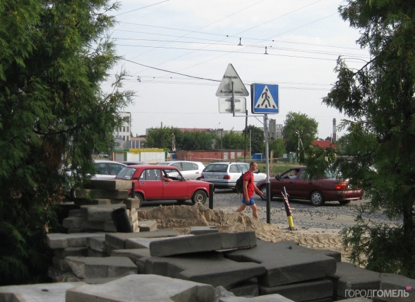 С другой стороны (возле магазина «Легион») вырытый котлован оградили розовой сеткой. Пешеходных мостиков нет и, судя по всему, не предвидится. Люди ходят по проезжей части.
