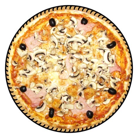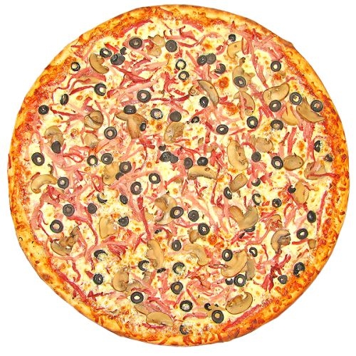 Состав: грибы, ветчина, оливки, моццарелла, пармезан.