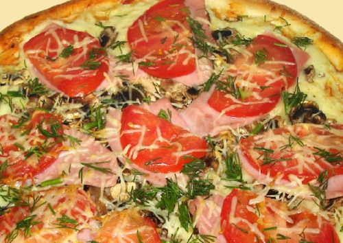 Состав: ветчина, грибы, лук, свежие помидоры, моццарелла, томатный соус.