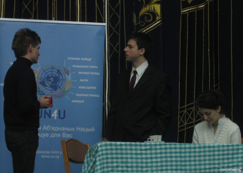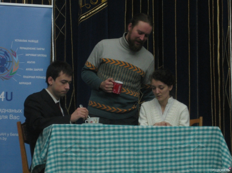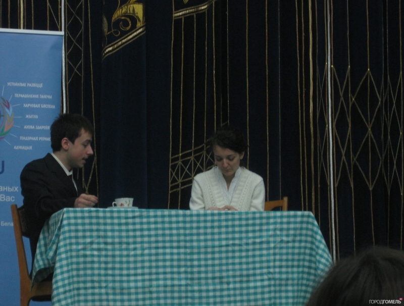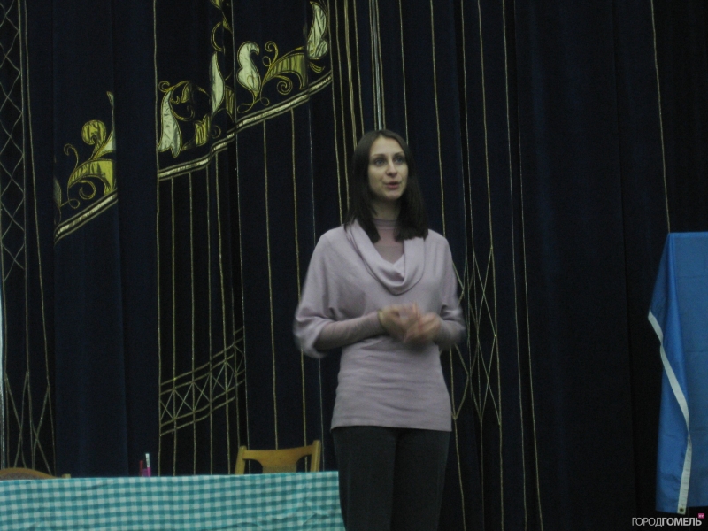 Ольга Белорусова, специалист по связям с общественностью фонда ООН в области народонаселения. Она рассказала о миссии ООН, вкратце о проблеме насилия в семье, а девушки из театра Eye предложили зрителям несколько упражнений, чтобы раскрепоститься, оживиться и приготовиться к активному участию в дальнейших действиях.