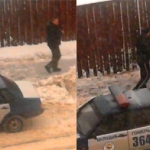 По словам автора видео, мужчина расчищал себе выезд. В это время туда подъехали сотрудники ГАИ. Мужчина попросил их отъехать, а они отказали. Слово за слово — и начался конфликт.