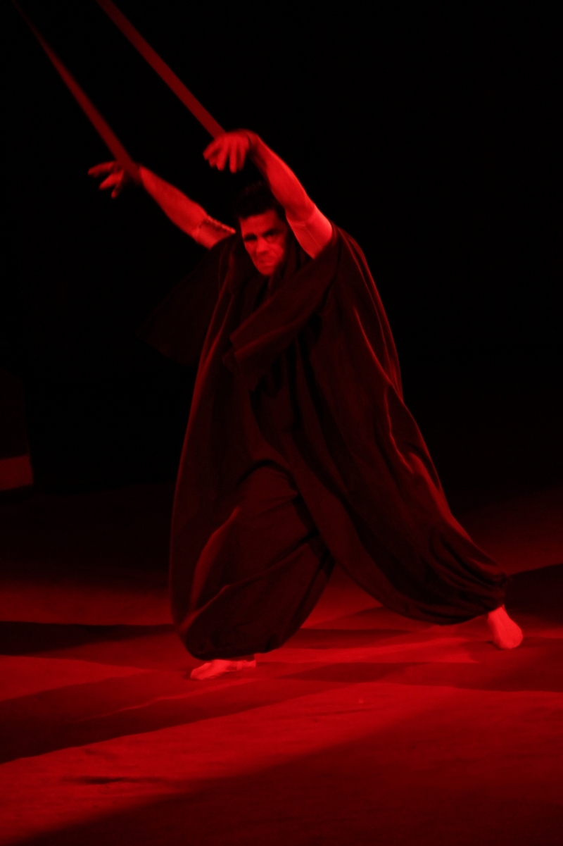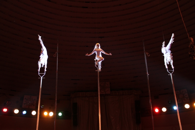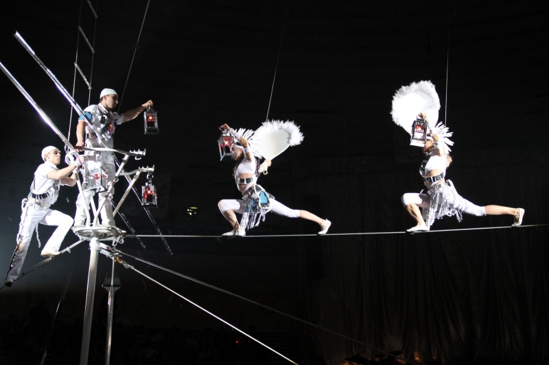 Темнота в зале, канатоходцы в белых костюмах, с фонарями, творившие на канатах что-то невообразимое, все это подчеркивалось музыкой и создавало неповторимую атмосферу. Дополнительно к имеющемуся обычному канату натянули еще 4 наклонных каната, и канатоходцы сразу шли в нескольких направлениях, поднимали друг друга на руках, и в общем, это было действительно феерическое шоу. Руководитель – Алихан Алиханов.