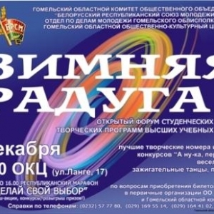 Открытый форум студенческих талантов «Зимняя радуга 2010» состоялся 3 декабря в Гомеле. Этот фестиваль, который ежегодно собирает полный зал общественного культурного центра, является своеобразным финалом конкурса «А ну-ка, первокурсник!» в котором принимают участие все высшие учебные заведения Гомельской области. Это практически четырехчасовое действо в исполнении первокурсников и почти первокурсников раскрывает творческий потенциал еще вчерашних школьников на самой большой концертной сцене области.