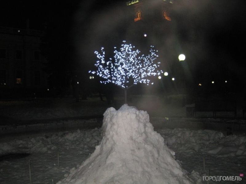 Гомельская сакура стоит в центре фонтана, напротив главного входа во Дворец Румянцевых и Паскевичей, посреди снежной модели «Фудзиямы». Фонарики сделаны так, что создают ощущение «пушистости» лепестков, очень нежно и мило.